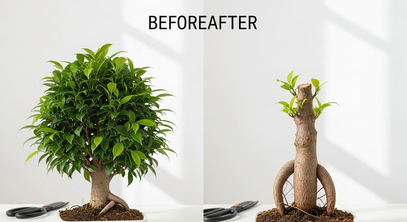 丸坊主とは、すべての枝葉を切り落とし、幹だけの状態にする剪定方法です。ガジュマルの強い生命力により、正しく行えば必ず新芽が出て復活します。