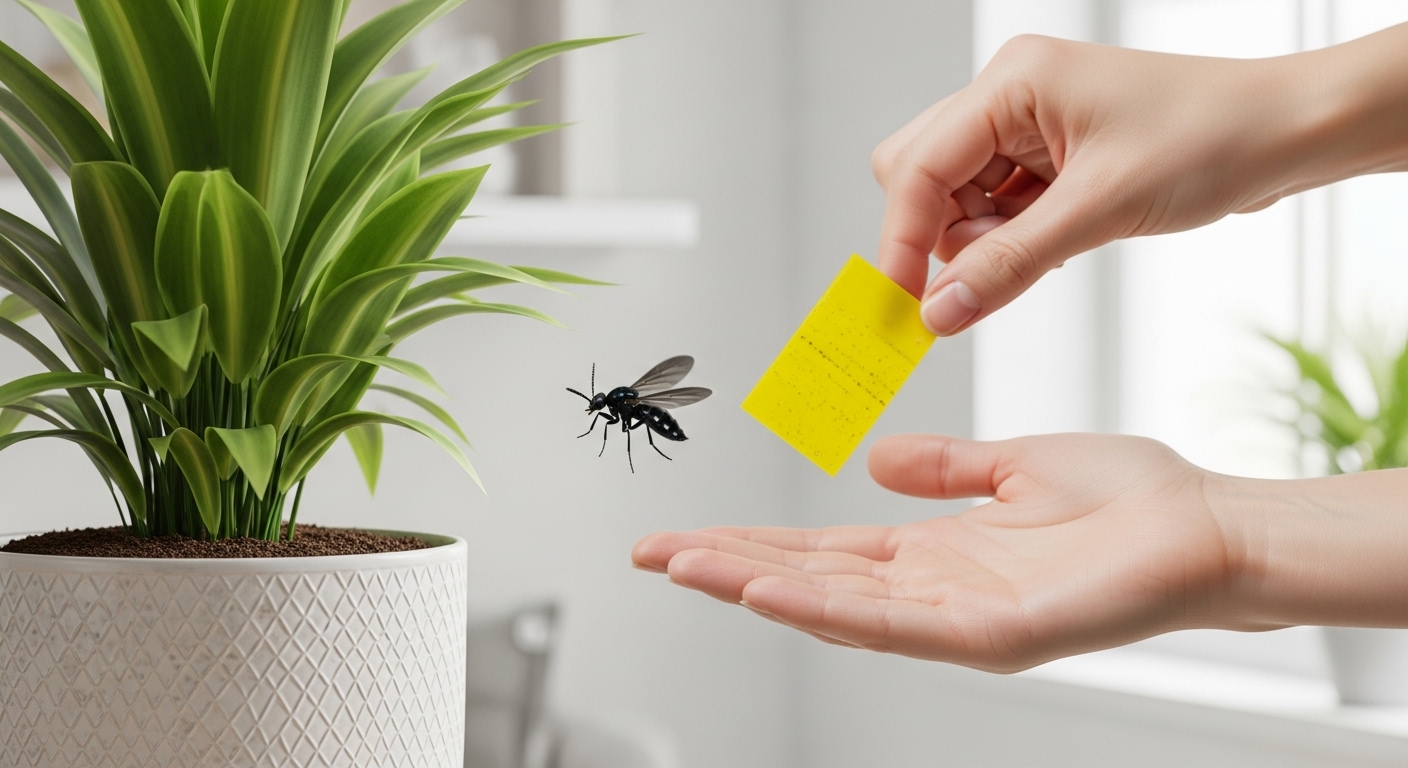 最もスマートな方法は、黄色い粘着シートを使うことです。キノコバエは黄色に誘引される習性があるため、面白いように捕獲できます。土に挿すタイプや吊るすタイプを、植物の近くに設置するだけです。薬剤を使わないので、室内でも安心して使えます。